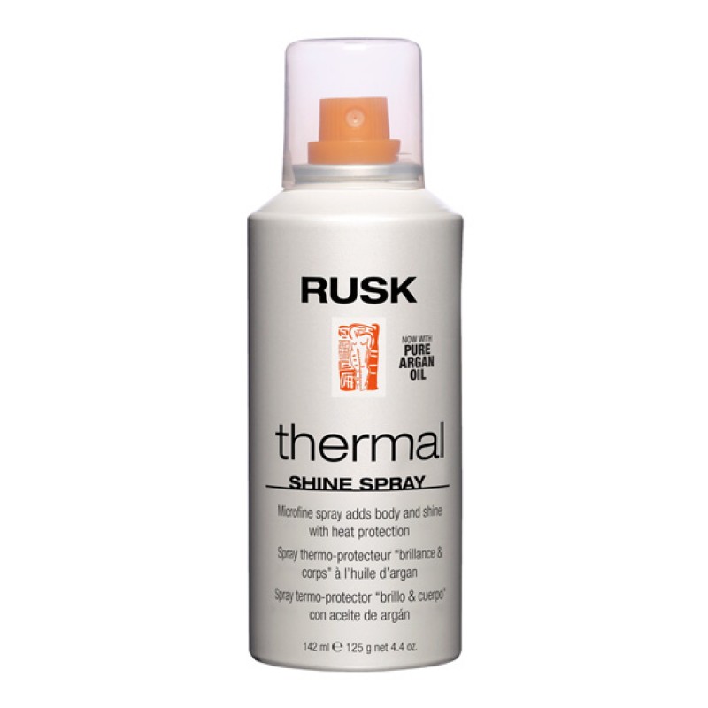 This superfine aerosol spray adds body and shine without buildup while protecting the hair shaft and cuticle. Enriched with silicones to protect and condition the hair where most needed, it is formulated to eliminate frizz and leave hair smooth, straight, sleek and shiny. Now with argan oil, RUSK® Thermal Shine Spray is formulated for great conditioning and incredible shine.
