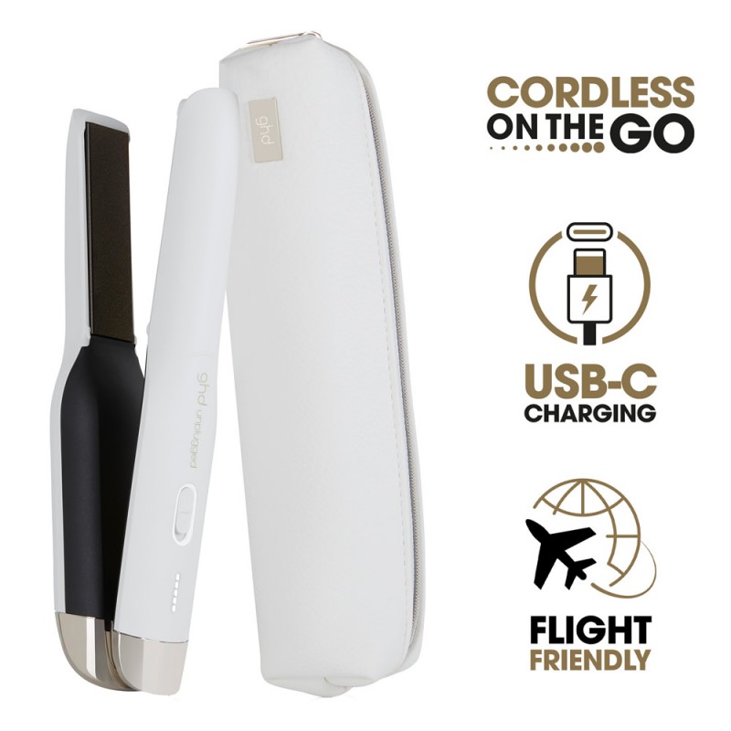 Featuring hybrid co-lithium technology, the ghd unplugged is powered by a bespoke lithium-ion battery to deliver long-lasting power and up to 20 minutes* of continuous ghd styling performance. Flight-friendly and complimented by a heat-resistant, styling case to protect your straightener, unplugged empowers you the feeling of a good hair day no matter where you are.