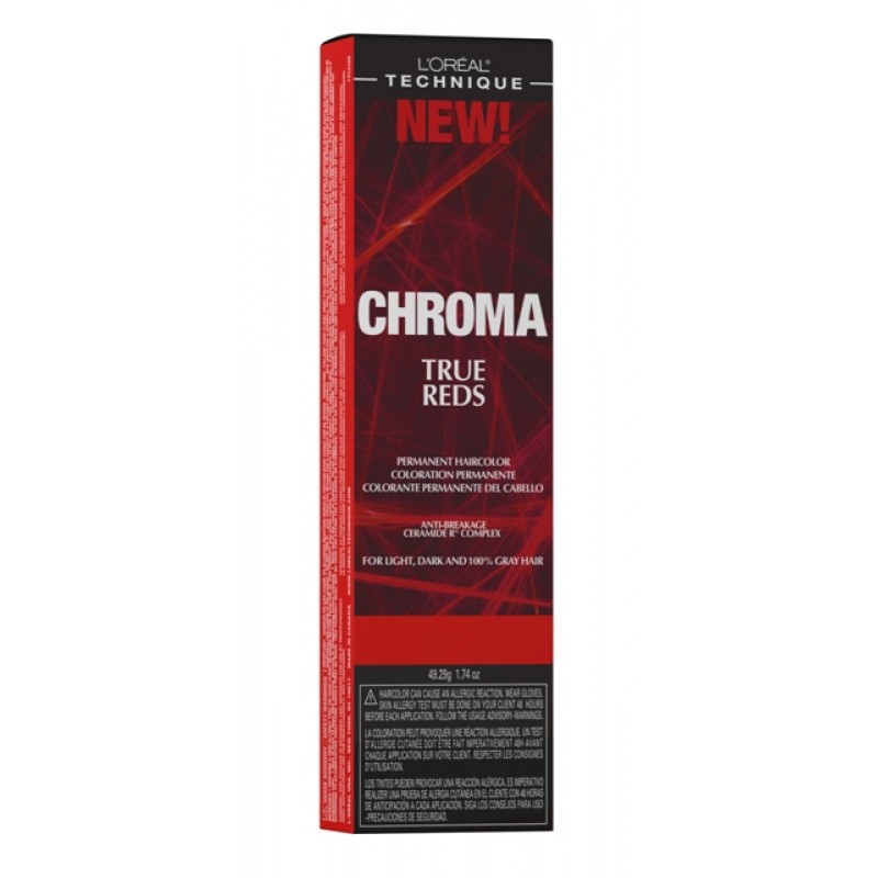 CHROMA TRUE REDS is a permanent hair color range by L’Oreal Technique consisting of 6 shades that provide lift and deposit of high intensity True Red tones to the hair. The shades are mixed in a 1:1 ratio with Oreor Crème Developer 20, 30 or 40 volume. Processing is 30 minutes at room temperature.
