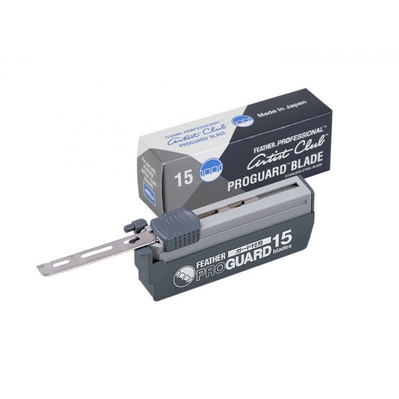 Feather Artist Club ProGuard Blades are recommended for a safe and comfortable shave. The ProGuard provides added safety because it features a guard. The blade guard tips are designed half rounded to help glide the blade across the surface. It offers a softer feeling that makes the shaving experience very comfortable. Due to the blade guard, it also provides durability as well as longevity. The ProGuard Blades are recommended for consumers to use at home or for barbers who are new to shaving. One cartridge contains 15 blades. The cartridge dispenser enables easy, sanitary insertion of new blades and safe disposal of used blades.