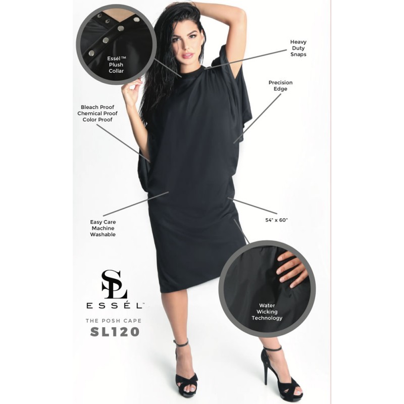 ESSEL is made with water wicking fiber to help keep clients dry, and edges are sewn at a 45 degree angle to keep the cape from de-threading during washes.