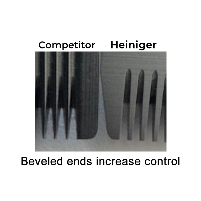 Heiniger’s high-quality detachable clipper blades are crafted by robotic machines that ensure consistent precision and guarantee optimal cutting performance.  Their deeper blade design allows more hair to be cut on each pass, and the wider cutting area slices hair like a shear versus chopping like conventional blades.  The ends of each blade are beveled for better control around tight areas, and they stay sharper and cooler longer than their competitors.