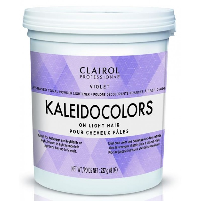 Clairol Professional(R) Kaleidocolors Violet is a clay-based tonal powder lightener for use on LIGHT BROWN to LIGHT BLONDE hair. Ideal for balayage and highlights. Lightens hair up to 5 levels. MIXING RATIO: 1:2 with 20 Vol Clairol Professional(R) Crème Permanente Developer