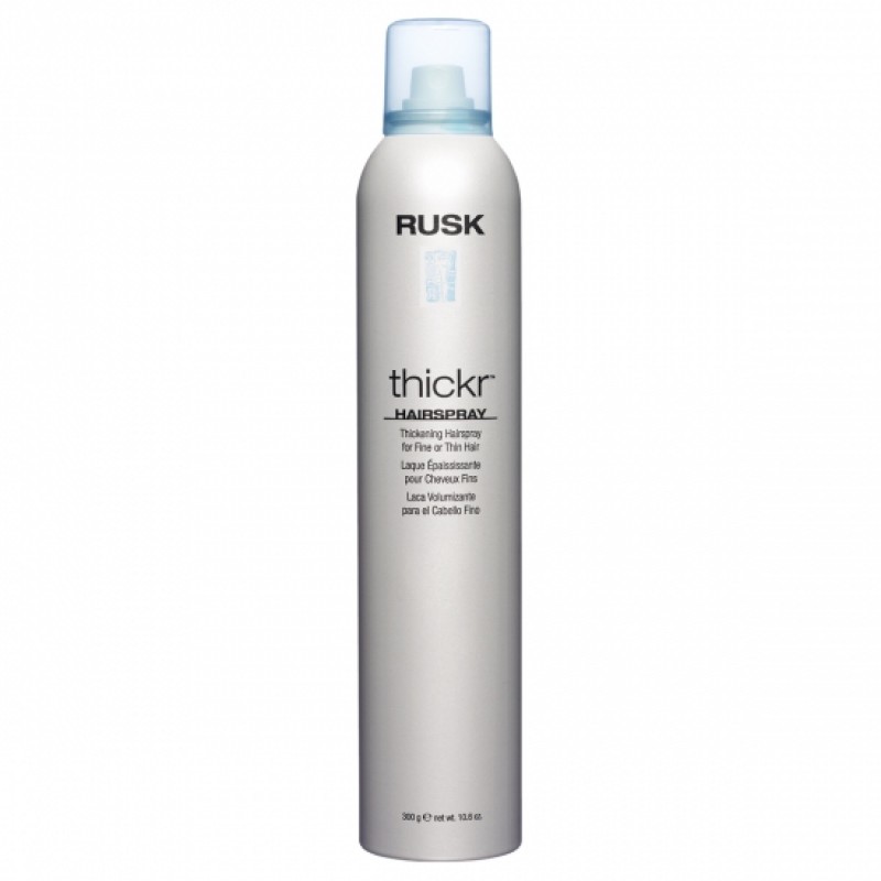 Get powerful texture, shine and extra hold, with added UV blockers to protect color-treated or highlighted hair, with RUSK® Thickr® Thickening Hairspray. Ideal for fine, limp or lazy hair, this hairspray is infused with lusterizers, conditioners, and moisturizers that provide body, texture, and supple touchable hold.